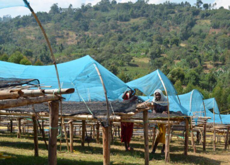 また、周囲を小高い丘に囲まれたウォッシングステーションでは冷涼な山風が吹き込んでおり、この風を利用して3週間ほどかけてナチュラルコーヒーの乾燥が行われます。アフリカンベッドは、農業用の遮光シェードを備えた日陰干し用のアフリカンベッドもあるほか、通常のアフリカンベッドにおいても日差しや気温に合わせて簾を利用しながらゆっくりと時間を掛けて乾燥させ、理想的な品質を目指しています。